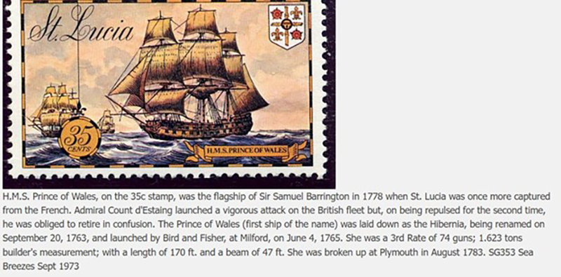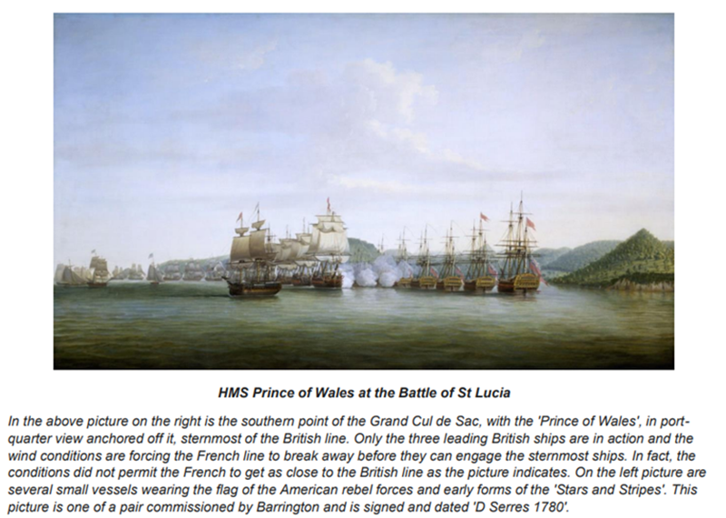 In 1778 Barrington commanded British forces in the capture and defence of St Lucia in the Caribbean. The ship played an important role during the naval battle fought there when the French fleet under the Comte d’Estaing attempted to retake the island.