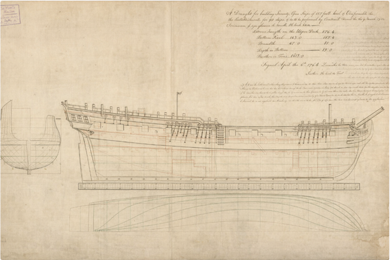 Original Admiralty construction plan for the seventy-four-gun ship HMS Prince of Wales (1765).